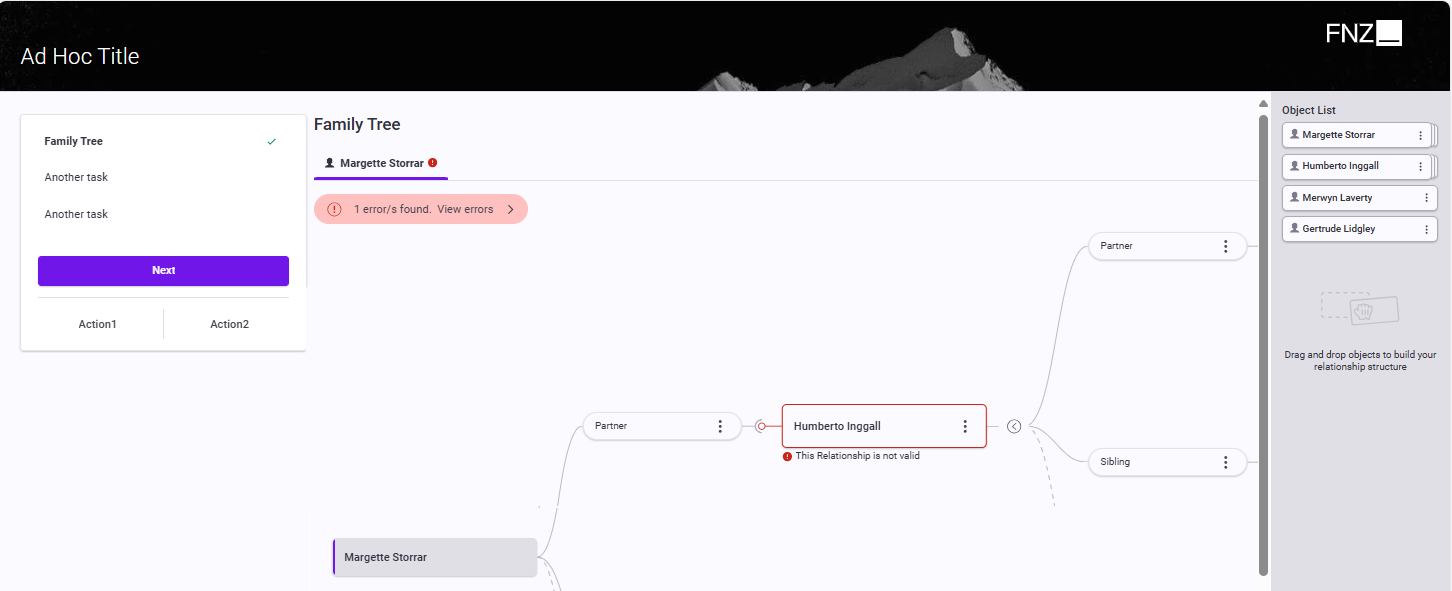 | Page Title (UI) | Name of the App Task in FNZ Studio Runtime, as displayed at the top-left of the page (e.g., Account Relationships in the second image above). | Process Editor Properties tab > Runtime Title field. You need to select a Label Business Object. In case the property is not set, it shows 'FNZ'. This property is mandatory for App Tasks included in Ad-Hoc Sub-Processes, in which case, the page title is displayed at the top of the content area. |