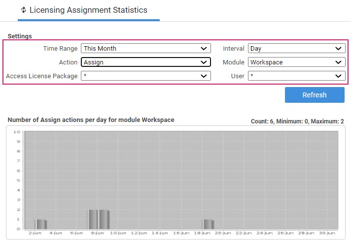 The upper chart is connected to the filter settings and is used to show the number of actions (assign, release, unbind or deny), aggregated over a given interval (day, week, …), for a given time range (this month, last month, …), and some more filter settings.