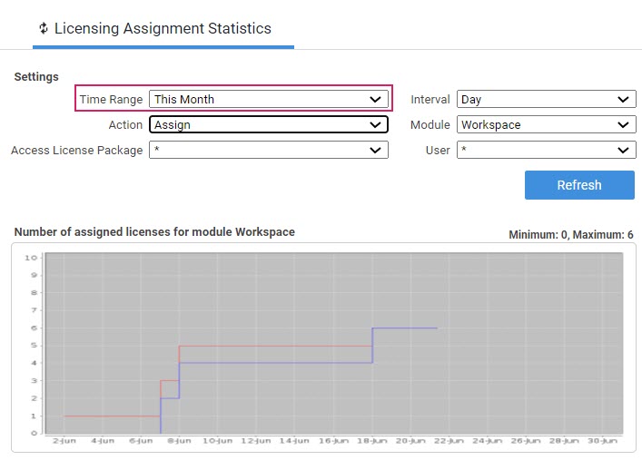 The chart at the bottom is independent of the filter settings, except for the Time Range filter. It shows the accumulated number of active (assigned but not yet released or unbound) access licenses. It can be thought of of as a counter starting at the beginning of the license history. For every assign action, the counter is incremented by one (there is now one more assigned license), and for every release or unbind, the counter is decremented by one. By doing this for the complete history, one can see the number of assigned licenses at any day in the past.