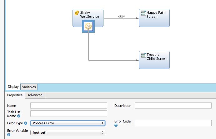 While you model your process along all typical variants the execution path can possibly take, it's still a good idea to include error conditions in your application. The handling of errors should raise awareness of the error condition and provide a path to revert or resolve the condition from within the process flow. This avoids situations where the process becomes suspended, thus requiring cumbersome administration activities.