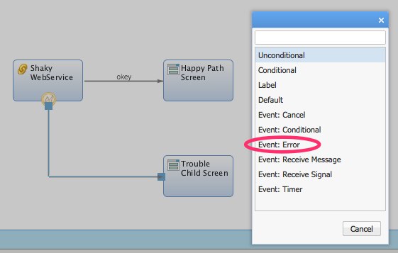 Model an exception path just like you would model any path in your process. For Connections, select Event: Error as a Connection Type. Selecting this type creates a yellow icon on the source element of your Connection, a so-called Intermediate Error Event Handler.