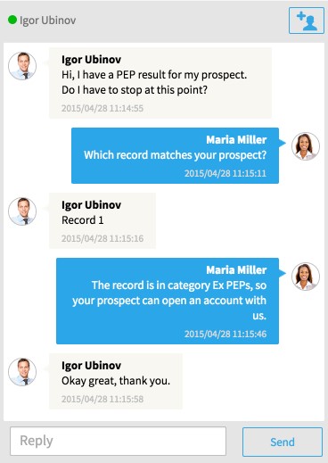 If users are logged into FNZ Studio Runtime and are permitted to see a chat window, such users are automatically registered as being online in that chat. They are then immediately able to use the chat window to communicate with all other users who have access to the chat. In this way, users working on a common task can communicate in a chat associated with that task.