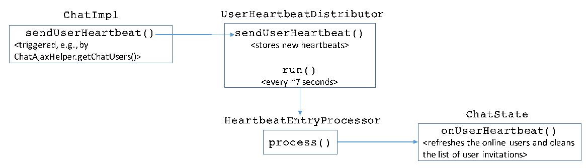 Users within a chat are required to periodically send heartbeats in order to be online, for example, see ChatAjaxHelper.getChatUsers() in the WorkspaceCollaboration extension. Heartbeat updates are triggered via the Chat.sendUserHeartbeat() method, which simply passes the user identifier to the UserHeartbeatDistributor thread - see Figure 2. Approximately every 7 seconds the above thread cleans the list of received heartbeats by means of an entry processor which calls the onUserHeartbeats() method on each ChatState instance. This removes offline users and expired invitations.