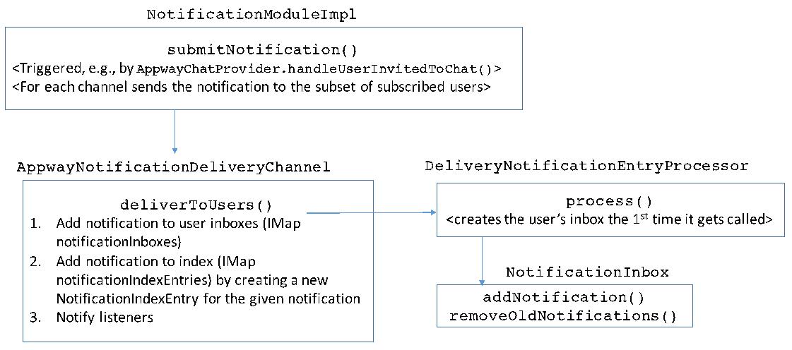 The NotificationModule delegates all the operations related to topics to a NotificationTopicManager, which are stored in a distributed map. All methods changing the state of a topic subscription (for example, subscribing a user to a topic) are performed using an entry processor. The appendix describes how topics can be used within the notification system.
