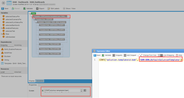 In the target Package, change the BAM_Dashboards Screen: Edit the first Template expression